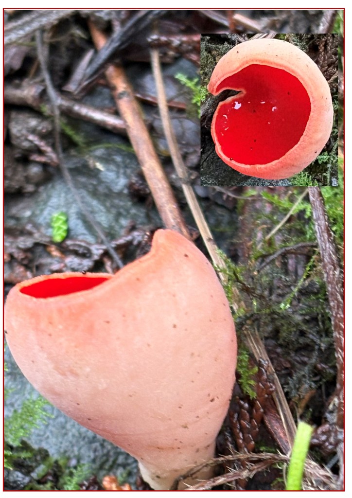 Gill was tidying up her garden ready for Spring recently. – “We found this in our damp dell whilst cutting back ferns to give emerging snowdrops more light. This is a Scarlet Elf Cup (Fungus), A beautiful deep scarlet, hidden within the soft blush cup. Vibrant colour, in a woodland floor of decaying twigs and leaves, and mosses. Creation surprises us with unexpected delights. Rich red on a gloomy, cloudy, drizzling day.”