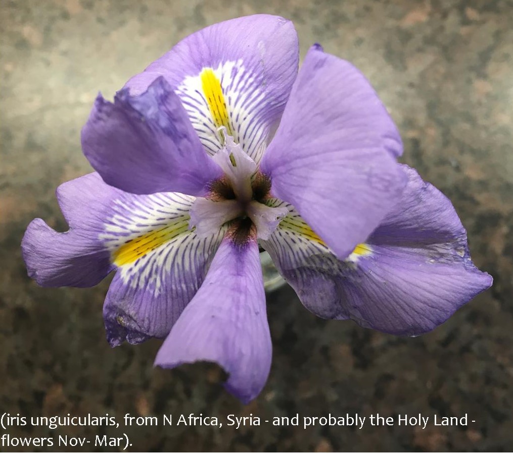 Which is why the photo I have chosen to head this piece is of an Iris unguicularis which originates in North Africa, Syria and possibly the Holy Land, not to mention Cumbria where this photo was taken by my dear friend Gill Henwood. She tells me that it flowers from November to March.
