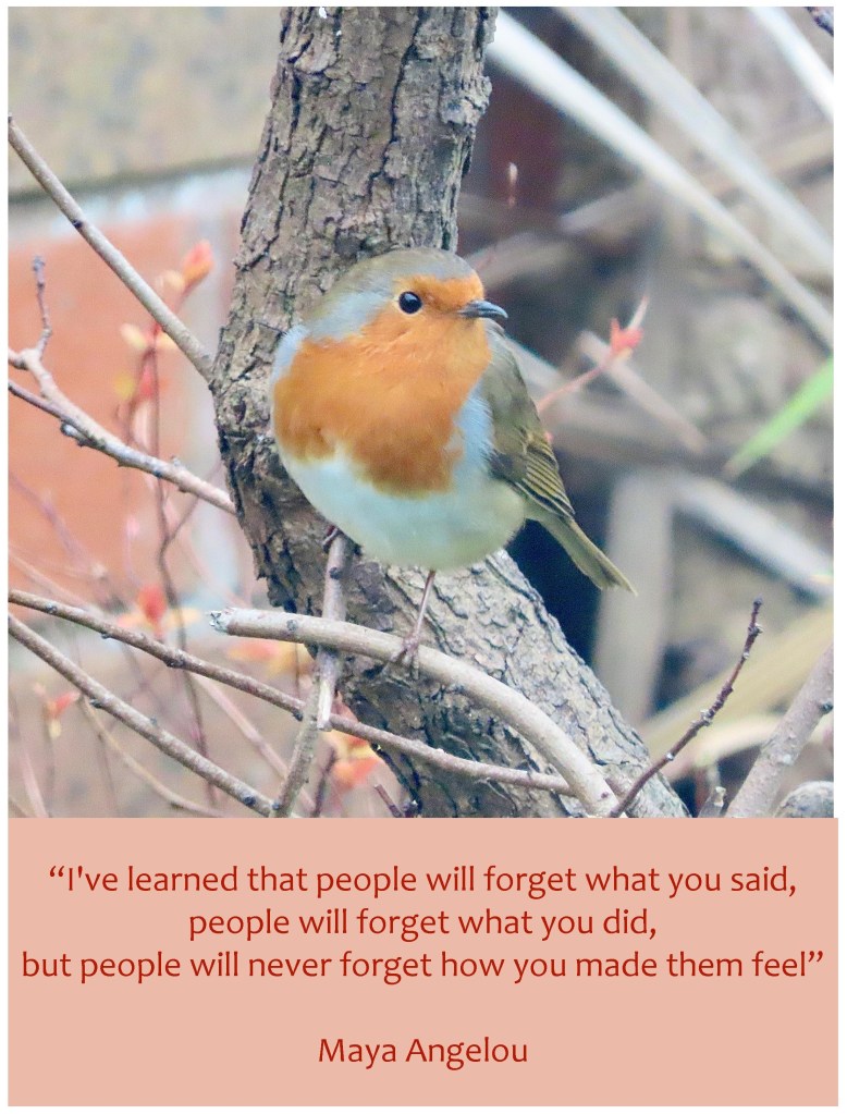 The quotation from Maya Angelou speaks of how we remember people for the way they make us feel.We all have people we turn to when we need a shoulder to cry on, an ear that will listen or someone who can hug us. Hopefully, we are such a person for others. In this case, the lovely little Robin makes me feel happy. This little creature is uplifting and in giving pleasure expects nothing in return.