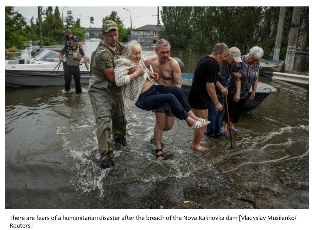 With humanitarian and ecological disasters still unfolding, it is already clear that tens of thousands of people have been deprived of drinking water, many are homeless, crops are ruined, land mines have been displaced, and the stage is set for long-term electricity shortages. Evacuation efforts are under way – about 3,000 have fled so far – amid a sense of despair as people try to wade through the rising floodwaters to safer locations. (Aljazeera)