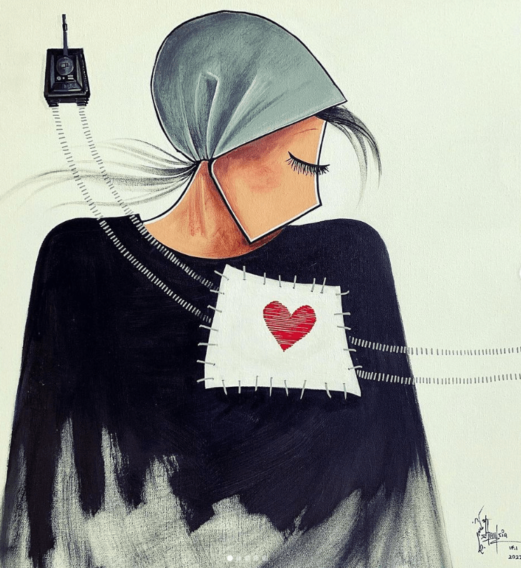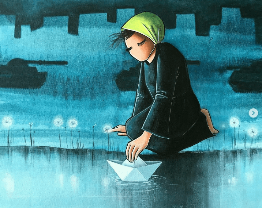 Shamsia says that, “The character in my paintings sometimes plays different roles such as a combatant or a refugee with no future. At times, she searches for peace, and sometimes she has no identity whatsoever. She also gets lost in her dreams as well as the pain and sorrow, she struggles with the past and the future but is a patriot who loves her homeland and fights hopelessness.” And who longs for Peace.