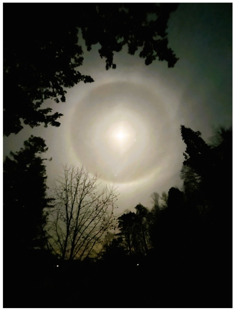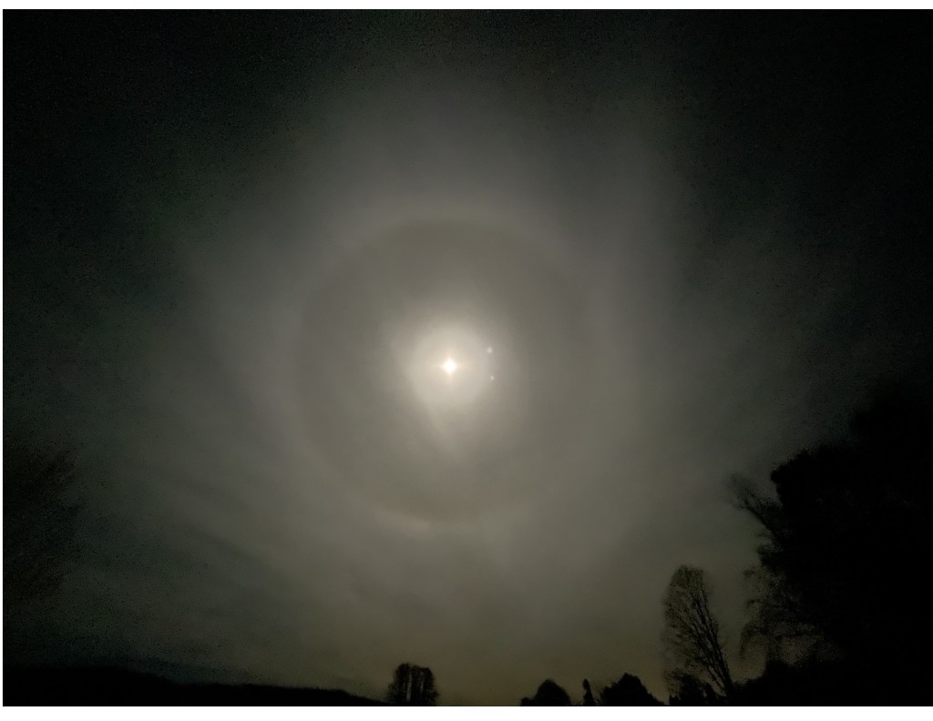 Lunar Halo A ring around the Moon was seen over the skies on Saturday evening The phenomenon is caused by the refraction of moonlight from ice crystals in the upper atmosphere. Gill Henwood took these photos of the moon over Cumbrian skies. Here, on the cusp of the Advent season, on the day which is sometimes called ‘Stir up’ Sunday, she offers this reflection to stir-up our thoughts towards the Christmas season ahead. It centres on the journey of the Magi who visited the infant Jesus, prompted by a bright portent in the night skies.