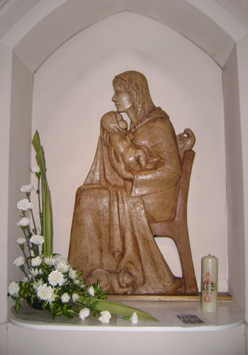 photo: Mary with Jesus, dove and cat! bas-relief statue by Josefina de Vasconcellos commissioned for the Lady Chapel of St. John the Baptist Parish Church, Epping