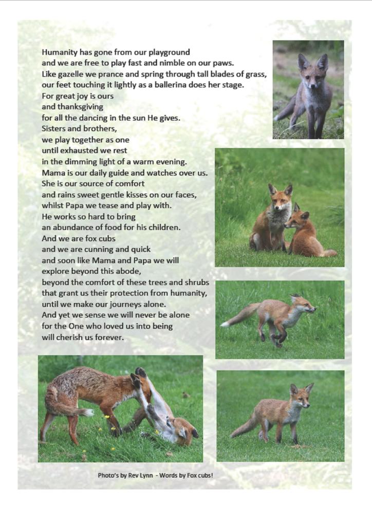 Well they are a lot bigger now and beginning to prepare themselves for adulthood with all the risks involved in moving out into the bigger world. For now they are enjoying life cared for by Mamma x 2 and Papa (also 2 of them we think). Of course, they are all cared for by Lynn and we know that our Heavenly Father cares for foxes and Humans Lynn has even taught them to do creative writing which is why we have the piece below. Enjoy!